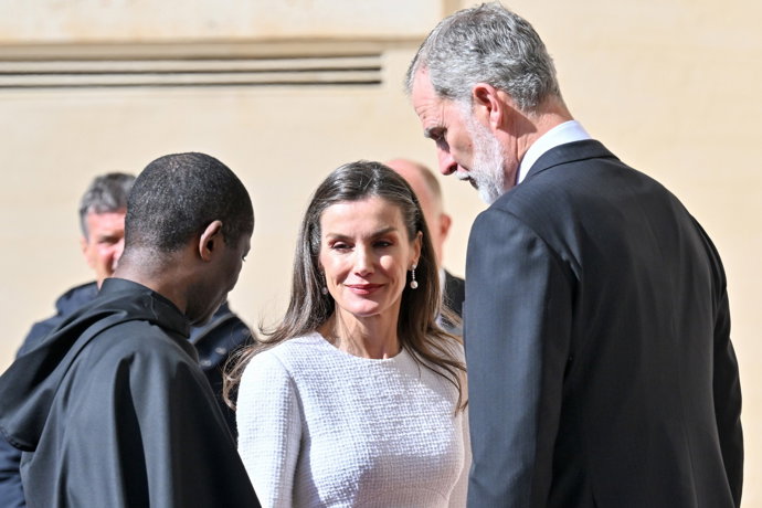 Sin embargo, y a diferencia de la misa inaugural del Pontificado, la Reina ha sorprendido prescindiendo en esta ocasión de la mantilla, apostando por dejar su melena suelta y ligeramente ondulada, con los mechones delanteros recogidos y la raya al medio.