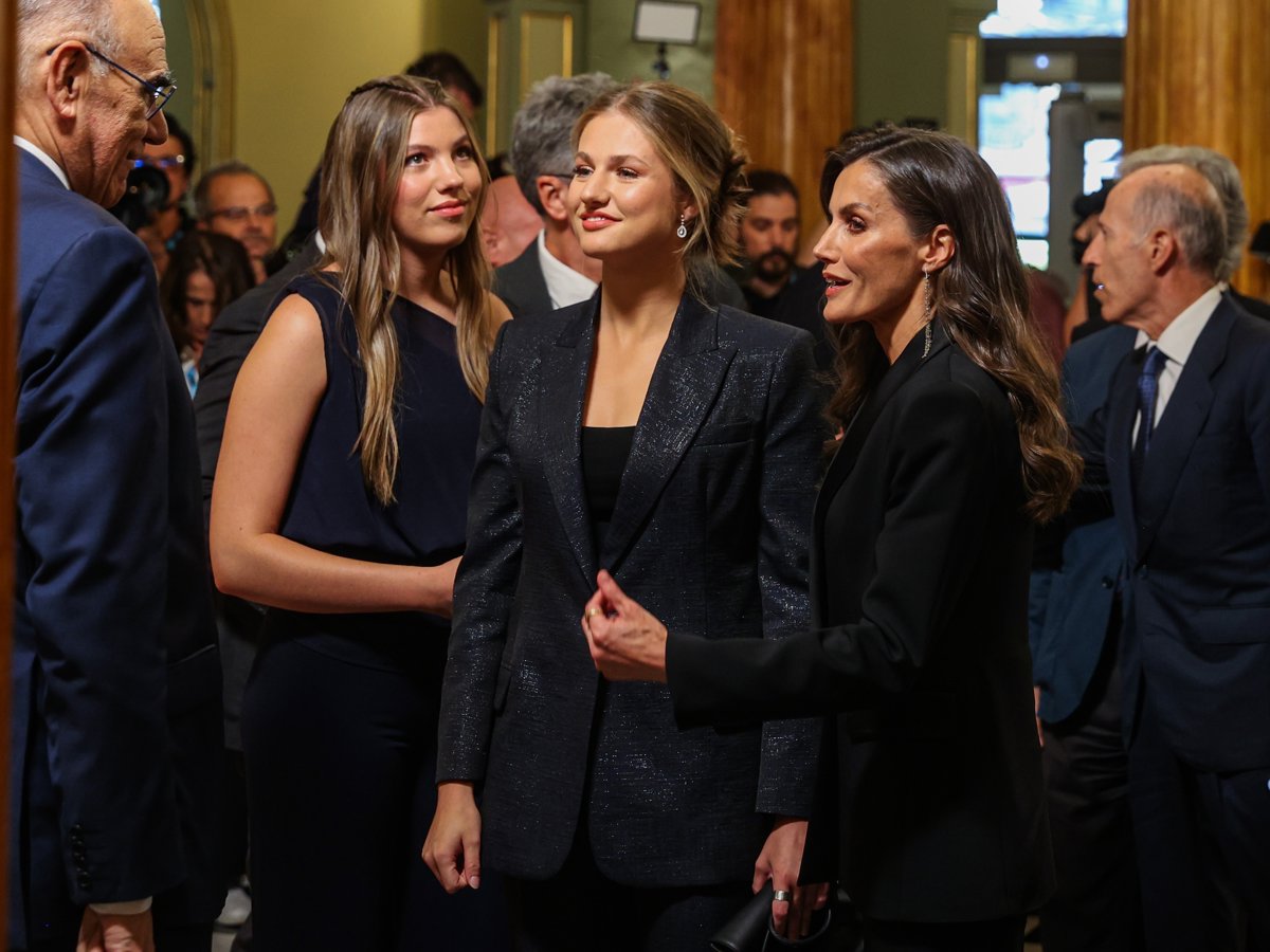 Por su parte, la Reina Letizia ha seguido con la tendencia de este año y ha rescatado de su fondo de armario un elegantísimo esmoquin de Mango en color negro -tonalidad que ha lucido también su hija mayor- compuesto por chaqueta entallada con solapa y bolsillos en rado, y pantalalón estilo palazzo.