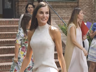 Una doble cita para la que ha elegido un look casual, fresquito y cómodo, con pantalones fluidos en color blanco y un top de punto en crema, sin mangas, con cuello alto y un favorecedor escote halter que ha vuelto a poner de manifiesto lo orgullosa que está la monarca de sus deltoides, sus bíceps y sus tríceps torneados.