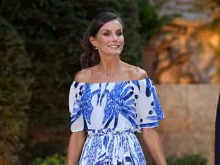 En sintonía con su estilo distintivo, la Reina ha optado por un vestido de escote Bardot, que destaca la elegancia de la zona de la clavícula y el bronceado de su piel, con una cintura ceñida y una falda que cae hasta los tobillos. El diseño, adornado con un vibrante estampado de estilo acuarela, incorpora elementos de animales y dos colores, blanco y azul, siguiendo con la esencia mediterránea.