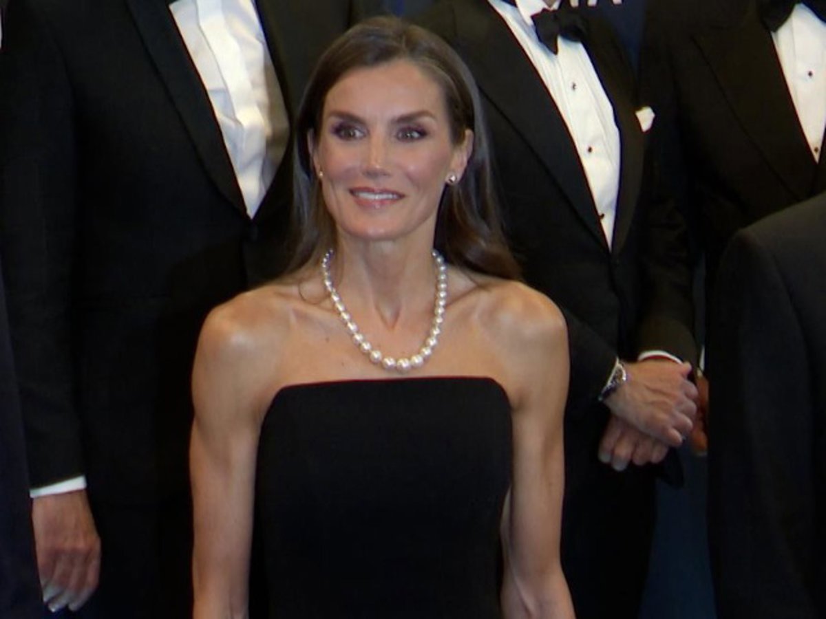 Como ya sucedió en ediciones anteriores, la reina Letizia volvió a conquistar a todos con un estilismo impecable con el que aunó la elegancia y la sencillez apostando por el siempre correcto 'total black'. En esta ocasión la esposa del Monarca estrenó un nuevo diseño palabra de honor y corte midi con el que volvió a presumir de escultural figura. Para completar su elección, la Reina se decantó por un sencillo collar de perlas perteneciente a las joyas de pasar compuesto por 37 perlas grandes.