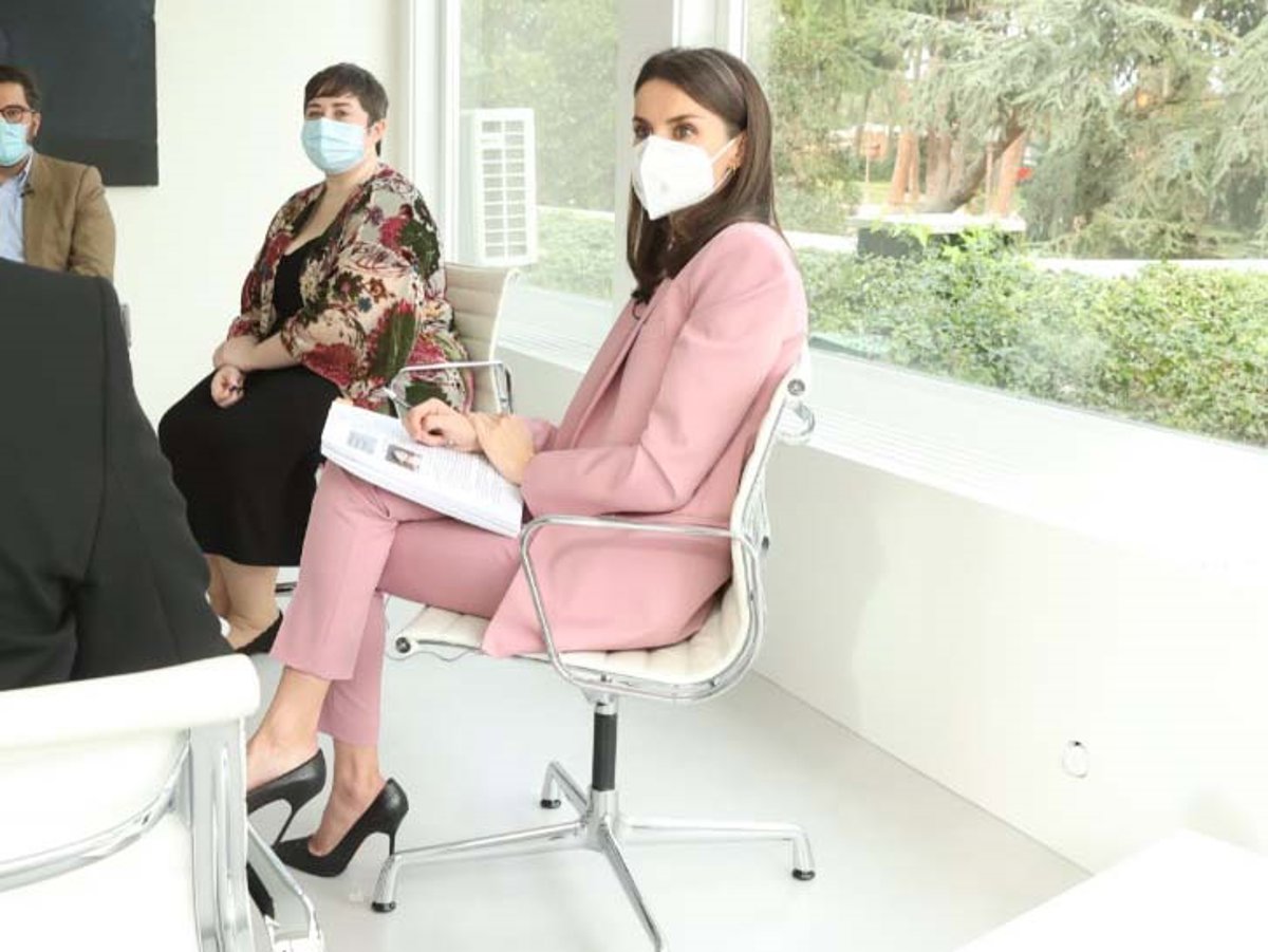 Para el acto la Reina ha vuelto a apostar por potenciar su estilo working girl y ha lucido, una vez más, uno de sus conjuntos favoritos, que le hemos visto en numerosas ocasiones desde que lo estrenó a finales de 2019. Su traje sastre rosa palo de Hugo Boss, un color que adelanta la primavera y que favorece especialmente a Doña Letizia.