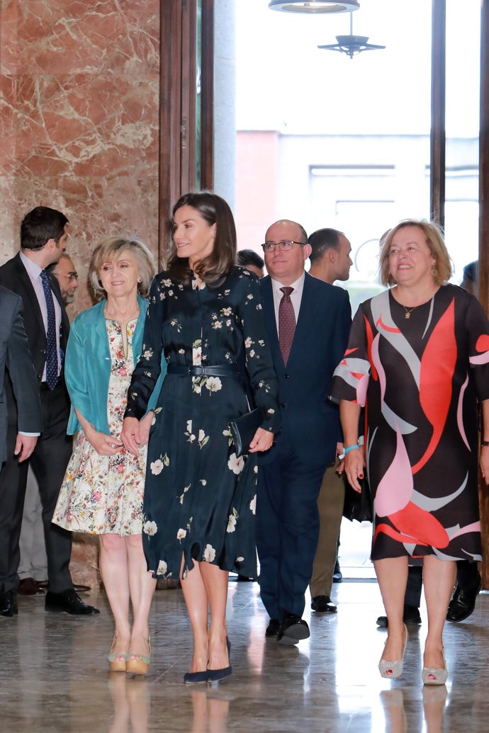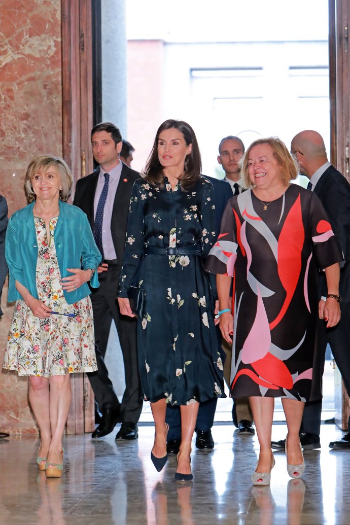 Para la ocasión, la mujer de Felipe VI ha querido rescatar un vestido que ya fue muy aplaudido la primera vez que lo lució. Se trata de un diseño camisero de largo midi, en azul marino con estampado de flores blancas y la cintura ceñida con un cinturón fino, firmado por Massimo Dutti.