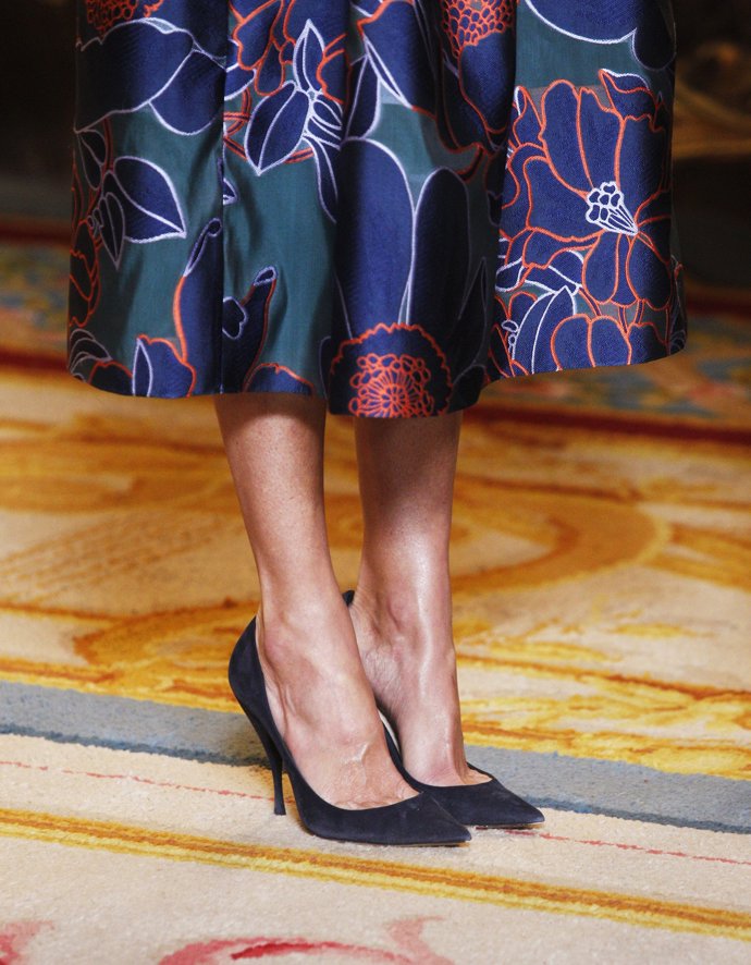 El vestido destaca por un elegante estampando de flores en tonos marinos y coral sobre un verde botella, que la mujer de Felipe VI ha combinado con unos stilettos azules de terciopelo, en el mismo tono que la cartera de mano.
