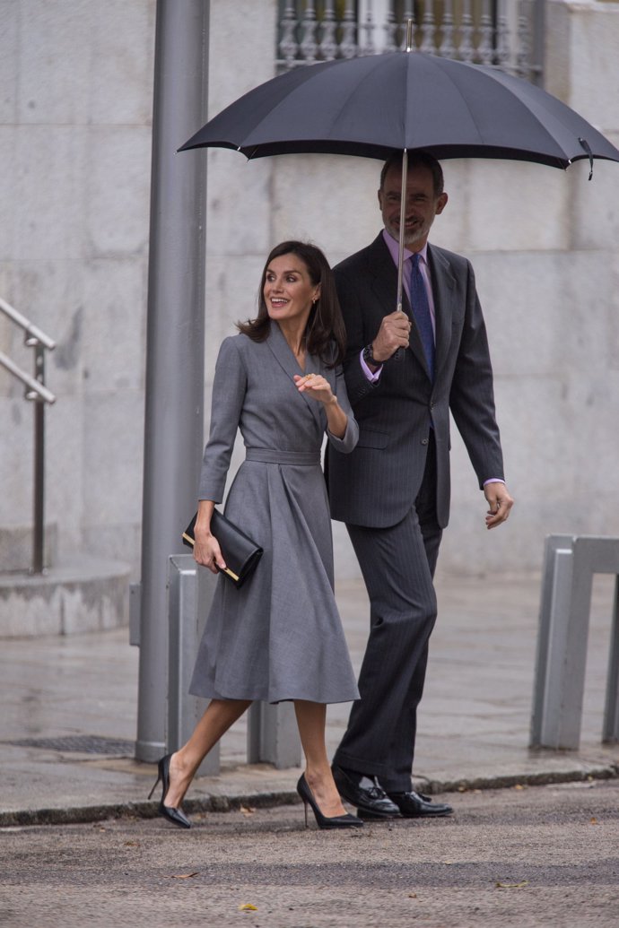 Cediendo el protagonismo al acto, Doña Letizia ha optado por un look de lo más sobrio y discreto. Se trata de un vestido que ha llevado en más ocasiones y del que se desconoce su procedencia: vestido gris con escote blazer, cuerpo entallado, manga francesa y falda midi evasé. Ha combinado su look con unos salones de tacón en color negro de Prada y cartera de mano a juego.