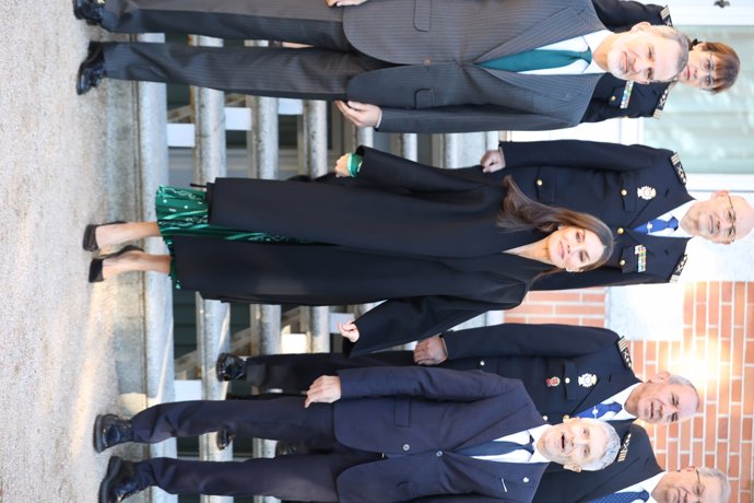 Para la foto de familia con el pleno de la Comisión Nacional para la conmemoración del bicentenario de la Policia Nacional, realizada en el exterior de Palacio, la monarca se ha abrigado con un abrigo negro de corte oversize.