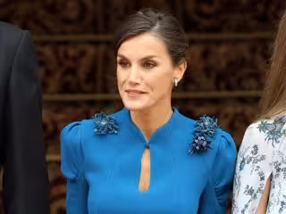 Un espectacular diseño de Carolina Herrera -sin duda su firma fetiche para las grandes ocasiones- en un intenso azul que estrenó con motivo de su viaje de Estado a Alemania en octubre de 2022 y que no le habíamos visto de nuevo hasta ahora. Sin duda, esperaba un momento especial para volver a lucirlo, y qué mejor que en la la jura de la Constitución por parte de su primogénita.