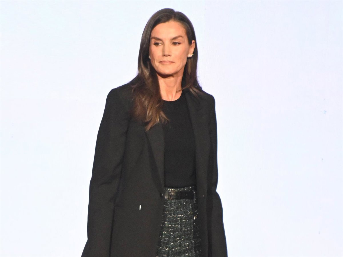 Y demostrando que no hay dos sin tres, su Majestad ha arrasado con un estilismo versátil, sofisticado y de máxima tendencia haciendo un 'mix match' de básicos que deberían formar parte de todo fondo de armario que se precie: Una blazer negra de líneas depuradas y corte entallado, un suéter de punto fino y cuello redondo también en negro, de la firma Falconeri, botines de tacón sensato al tono, y la estrella del look, un precioso pantalón de tweed de talle alto y pernera ancha en gris muy oscuro jaspeado con blanco. Un diseño de la firma Maje que estrenó en la celebración del 60 cumpleaños de la infanta Elena el 20 de diciembre de 2023 -en el que se reencontró con el Rey Juan Carlos- y que estábamos deseando que recuperase. En esta ocasión ha añadido además un cinturón estrecho para realzar su silueta.
