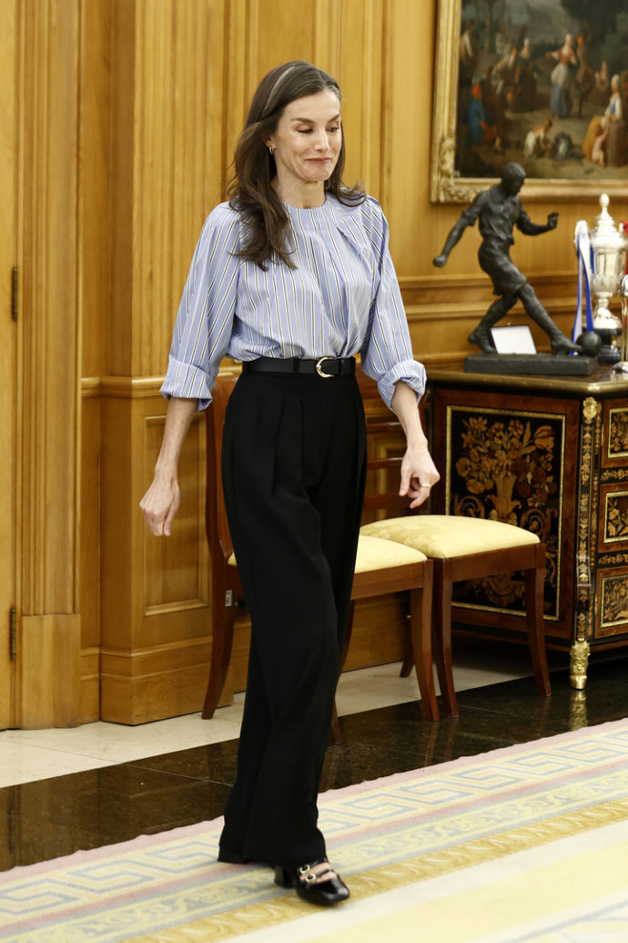 Un favorecedor diseño azul cielo con estampado de triple raya en blanco y negro, cuello a la caja con pequeños pliegues, y manga abullonada remangada, a la que ha decidido dar una segunda vida combinándola de una manera casi idéntica al día de su estreno, ya que aunque no son los mismos pantalones -entonces eran unos tipo culotte-, sí ha reeditado el resto del look con las bailarinas destalonadas de tacón sensato de la firma francesa Sèzane en negro, en concreto el modelo 'Babies Paula', que tiene en tres colores.
