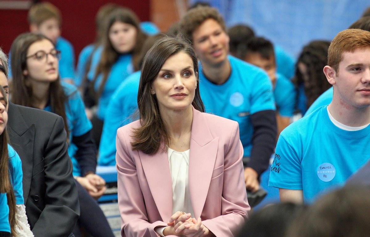 Un look ejecutivo en un color desenfado con el que la Reina ha vuelto a acercarse a los más jóvenes, un entorno en el que demuestra que se siente muy cómoda y despliega siempre su mejor sonrisa.
