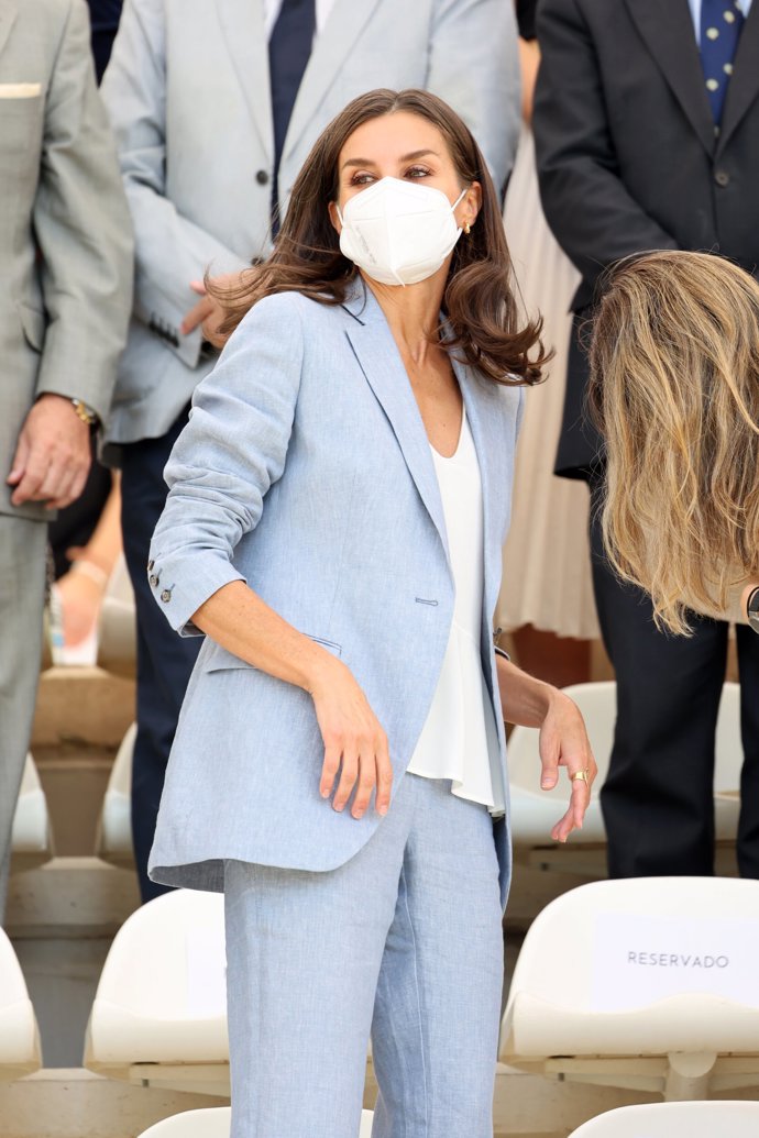 Letizia ha recuperado el look 'working girl' que tanto le favorece y que lució hace justo un año, aunque esta vez ha apostado por llevar la melena suelta en vez de un recogido con coleta.