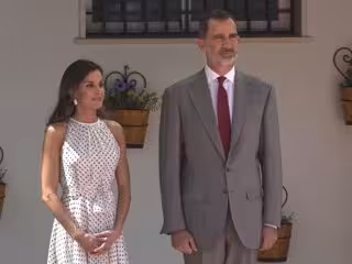 Un vestido es de gasa blanca con lunares negros, cuello halter, anudado a la cintura y de falda con volumen. Curiosamente, Letizia ha combinado esta prenda con los mismos pendientes de Cooklook que utilizó en primavera. Los zapatos que daban el broche final al conjunto han sido unas sandalias destalonadas de Steve Maiden con una tira de vinilo transparente. Mientras que en ocasiones pasadas los zapatos eran de color negro, esta mañana ha optado por el mismo modelo pero en tonos arena.