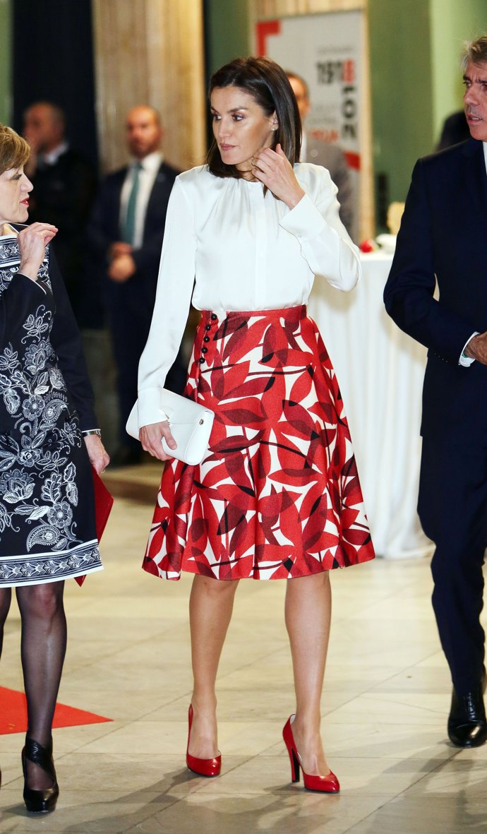 Para la ocasión se decantó por una falda midi de vuelo con estampado floral en rojo y blanco de inspiración oriental firmada por Carolina Herrera que combinó con una sencilla blusa blanca de Hugo Boss. El conjunto se completaba con unos stilettos rojos y un bolso blanco. Un conjunto ganador como homenaje a una de las instituciones más prestigiosas de España.