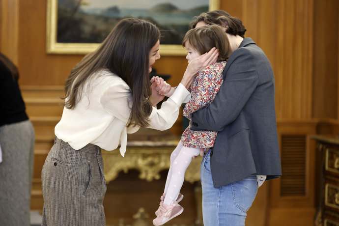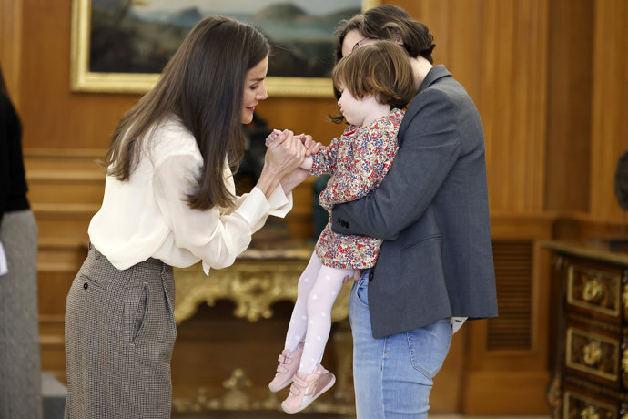 La Reina Letizia ha mostrado este miércoles, durante su último compromiso de la mañana, su faceta más tierna y maternal. Tras recibir en audiencia a una representación de la Sociedad Española de Cuidados Paliativos (SECPAL), y a los coordinadores del "Proyecto Cassandra" -una iniciativa pionera de cribado de cáncer de pulmón para la detención precoz de esta enfermedad- su Majestad ha tenido un encuentro con una representación de la Asociación Europea contra las Leucodistrofias en España, entidad que trabaja para mejorar la calidad de vida de las personas afectadas por leucodistrofias -patologías de origen genético que dañan de forma progresiva la sustancia blanca del cerebro y el sistema nervioso central- y la de sus familias.