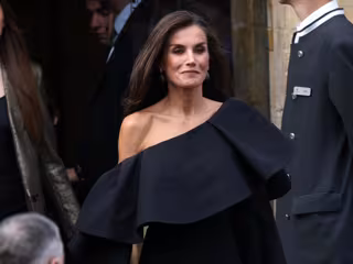 Expectantes por el estilismo que luciría la Reina Letizia esta tarde para los Premios Princesa de Asturias, la monarca ha vuelto a dejarnos a todos boquiabiertos al apostar de nuevo por un vestido con escote asimétrico, como el año pasado, pero con un original volante en la parte superior.