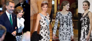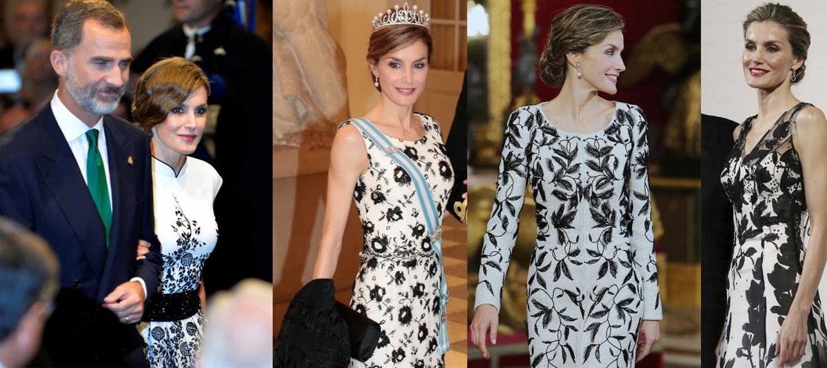También en unos Premios Cervantes pudimos verla con un diseño de corte lápiz de su modisto de cabecera. Fuera de España, Letizia apostó por un vestido de Felipe Varela en blanco y negro en la cena de gala por el cumpleaños de la Reina Margarita de Dinamarca.