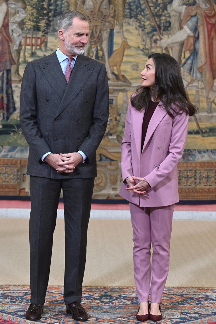 Para la ocasión, la monarca ha apostado por su traje en color nude de dos piezas, de la firma Hugo Boss, con doble botonadura cruzada que ha combinado con top y tacones a juego. Sin embargo, el jersey que ha lucido se ha llevado todas las miradas: de la firma italiana FALCONERI, un jersey 100% cashmere de cuello redondo, con manga larga y hombro ligeramente caído en tono burgundy. Por otro lado, su marido, un traje en color gris con chaqueta cruzada.