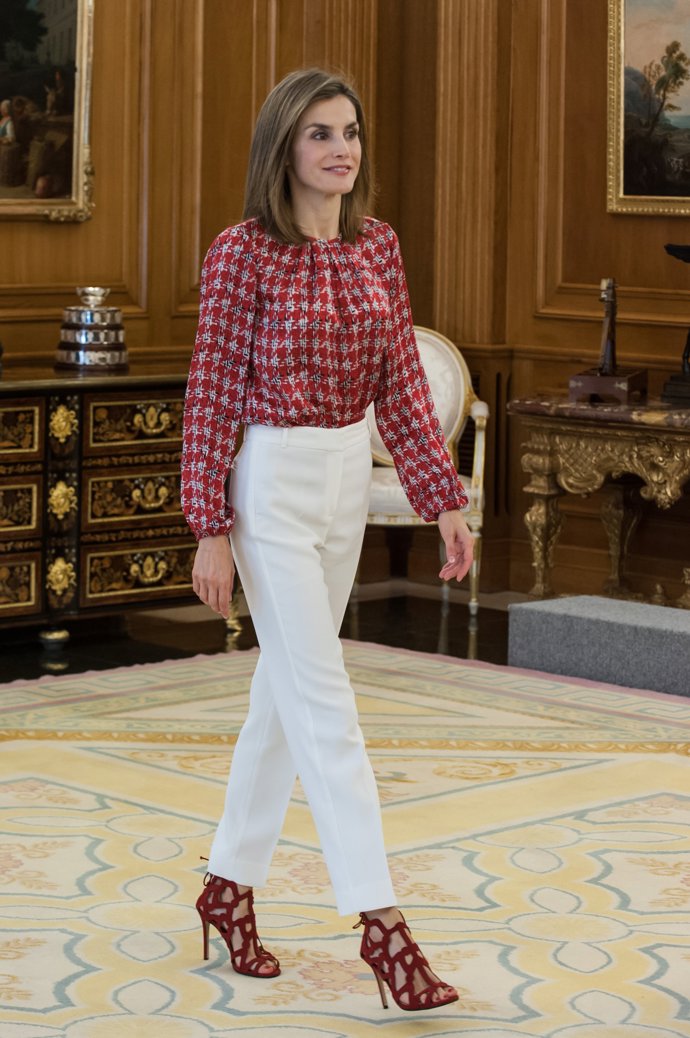 Doña Letizia comienza el nuevo curso apostando nuevamente por Carolina Herrera. La Reina acudió a sus primeras audiencias del nuevo 'curso' luciendo una camisa de la diseñadora venezolana por la que ya ha mostrado predilección en los útimos años. Además volvió a combinar esta prenda de lujo con el low cost con unas sandalias rojas de Mango.
