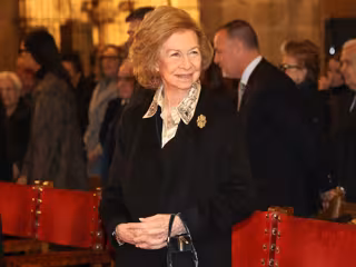 Todavía de luto por la muerte de Irene de Grecia, pero luciendo la mejor de sus sonrisas cumpliendo a la perfección con su papel institucional, Doña Sofía ha escogido para la ocasión una elegante combinación con pantalón y chaqueta en color negro que ha combinado con una camisa 'joya' satinada en color champagne con aplicaciones en la parte del cuello. Como es habitual, la abuela de la Princesa Leonor ha completado su estilismo dando una gran importancia a los complementos, y ha lucido a un broche dorado en la solapa además de varios collares de abalorios.