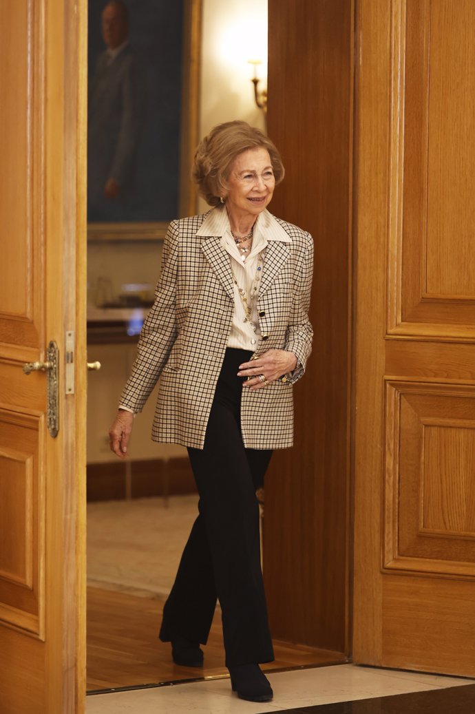 Siempre impecable y presumiendo una vez más de su sobria elegancia, la madre del Rey Felipe VI ha escogido para su único acto institucional de la semana una blazer de cuadros negros sobre fondo crema, blusa satinada blanca, pantalones de traje también en negro y botines de tacón sensato y ancho al tono.