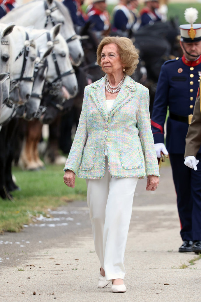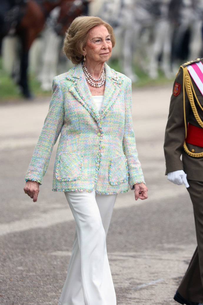 La Reina Sofía ha vuelto este viernes a la agenda Real para presidir, en solitario, el juramento ante la Bandera de España de personal civil en el Acuartelamiento "El Rey" de la Guardia Real en El Pardo. Un acto solemne en el que la madre del Rey Felipe VI ha deslumbrado con un look primaveral con el que, confirmando que ha dejado atrás el luto que lucía desde la muerte de su hermana la Princesa Irene de Grecia el pasado 15 de enero, ha dado una lección de elegancia que es pura inspiración para las mujeres mayores de 60 años.