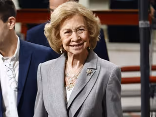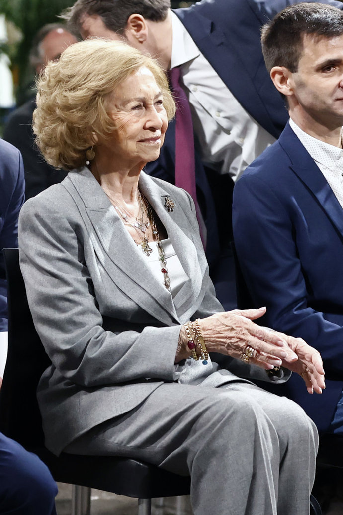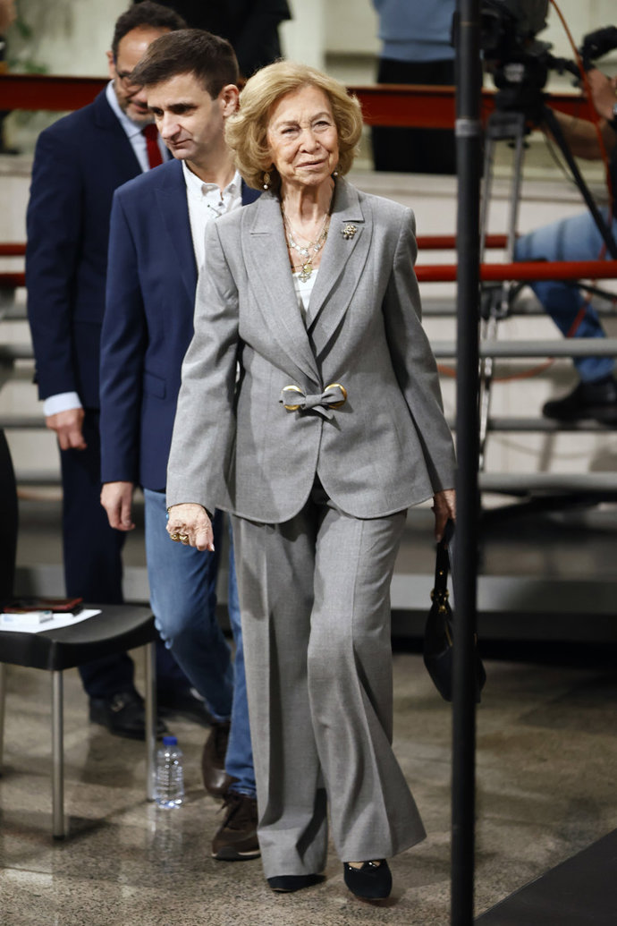 Una reaparición en la que la Reina Sofía, radiante y con una sonrisa perenne, ha aparcado el luto estricto que ha lucido desde el fallecimiento de su hermana para estrenar un precioso traje sastre gris -un color de alivio con el que sigue mostrando su dueño por la pérdida de Irene de Grecia- con detalle de lazo como cierre de la blazer.