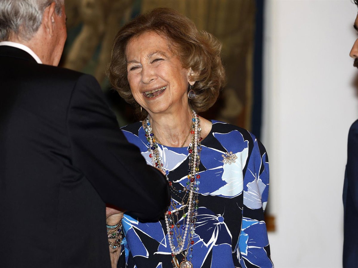 Especialmente sonriente y expresiva, e interesándose por esta labor solidaria con la que está comprometida desde hace años, Doña Sofía destacó no solo por la felicidad que ha desprendido en su reaparición tras el regreso del Emérito, sino también por su elegancia. La monarca lució un sencillo pantalón negro y un blusón de seda estampado en llamativos tonos azules, que complementó con sus ya característicos collares y pulseras de abalorios dándole a su look ese punto bohemio que se ha convertido en una de sus señas de identidad.