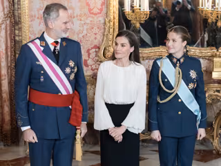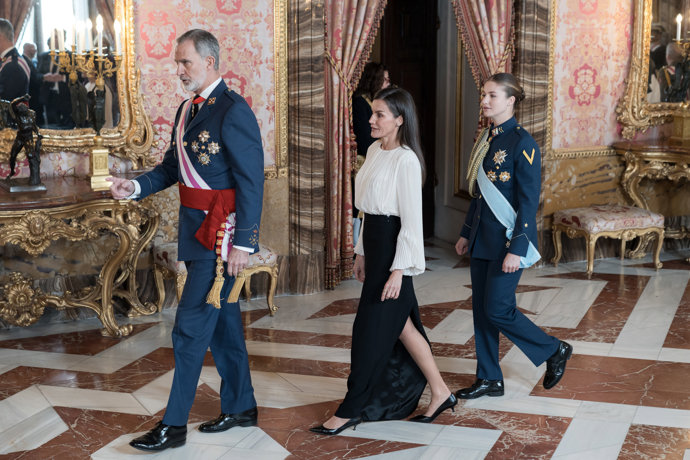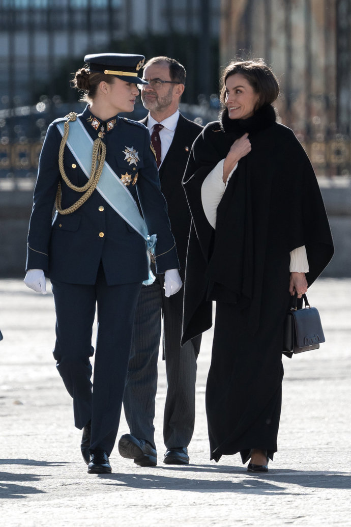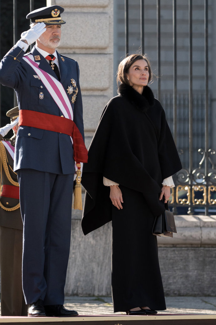 Doña Letizia, por su parte, ha vuelto a demostrar su inclinación por la discreción en este acto, optando por una larga falda negra combinada con una blusa blanca plisada de mangas acampanadas, un look sobrio y bicolor que respeta el protocolo y refuerza la seriedad de la cita. En la parte exterior del acto, donde las bajas temperaturas se dejaban notar en el Patio de la Armería, la reina ha completado el conjunto con un abrigo-capa de cuello de pelo, una prenda que ya se ha convertido casi en un clásico de su vestuario de invierno para este escenario.