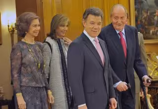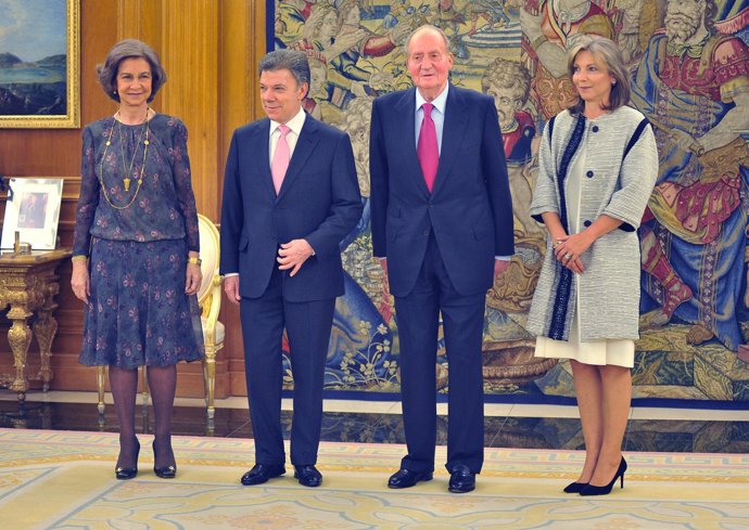 Sus Majestades los Reyes, ajenos a toda la problemática que gira entorno a su familia, en especial por la imputación de su hija la infanta Cristina, recibieron al presidente de Colombia, Juan Manuel Santos, y su esposa, María Clemencia Rodríguez, en el marco de la visita de trabajo a España del gobernante colombiano.
