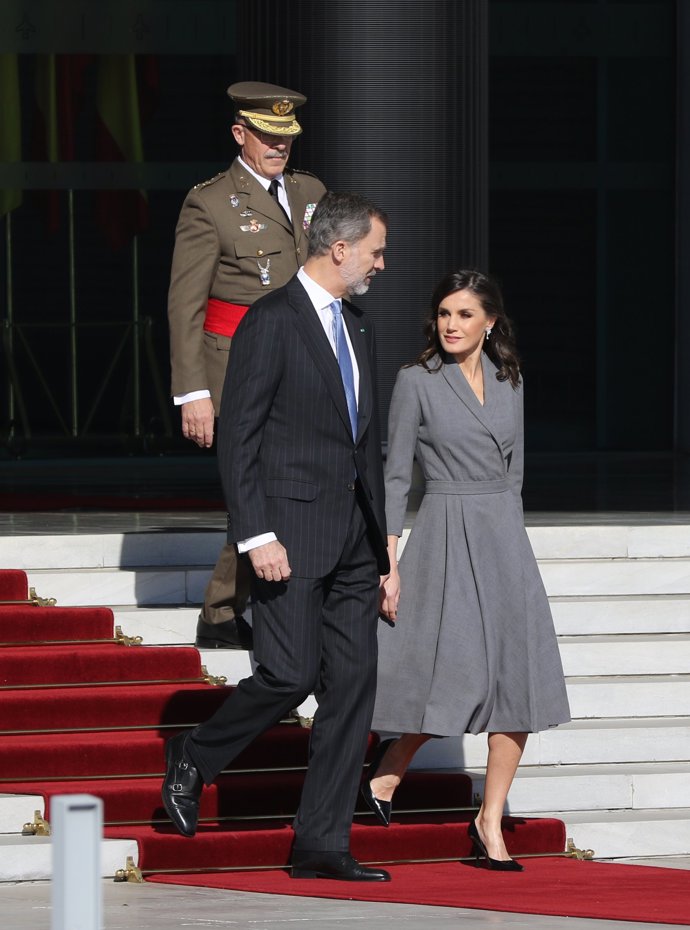 Para esta ocasión, Doña Letizia ha escogido un vestido gris con cuello cruzado y hombreras. De mangas tres cuartos y corte midi, lo ha acompañado de un cinturón en el mismo tono del vestido, a diferencia de otras ocasiones en que lo llevaba con un cinturón negro.