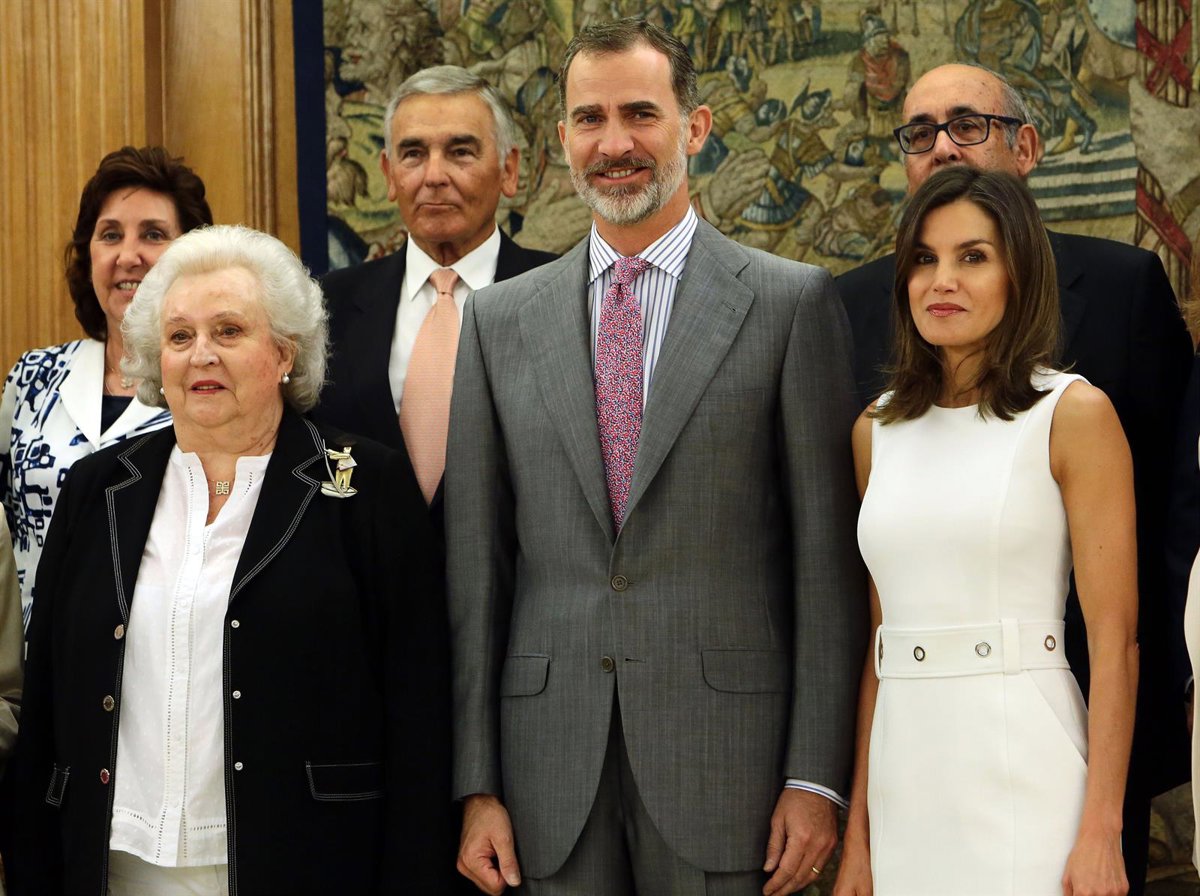 Este martes los Reyes Don Felipe y Doña Letizia han recibido en audiencia a miembros de Nuevo Futuro entre los que se encontraban la Infanta Pilar, tía del Rey Felipe, y presidenta de honor de dicha ONG que cumple ahora 50 años.