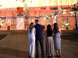 Después, fue el turno de Ara Malikian que ofreció un concierto exclusivo desde el balcón que hay frente a la Puerta del Príncipe. De pie frente a la fachada del Palacio Real y sin perder detalle de lo que veían sus ojos, los Reyes y sus hijas demostraban que son verdaderos seguidores del violinista al que ya habían visto en directo durante uno de sus conciertos en el Wizink Center de Madrid. Finalmente, el colofón de la fiesta llegaba con la proyección de un videomapping sobre la fachada del Palacio Real con la que los Reyes quedaban cautivados protagonizando algunas de las imágenes más tiernas de esta jornada histórica en el reinado de Felipe VI.