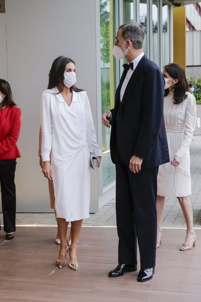 Apostando por la elegancia con un sencillo look 'total white', la reina Letizia eligió para la ocasión un vestido que ya le habíamos visto durante la inauguración de la temporada 2019/2020 del Teatro Real en Madrid. Se trata de un diseño de Lola Li con escote en uve y solapas tipo blazer, hombros estructurados y manga larga con puños ajustados.