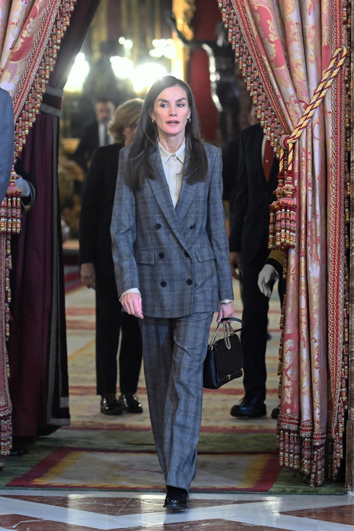 En clave working girl y dejando claro que son una piña en pleno tsunami mediático por la biografía de Don Juan Carlos, Doña Letizia ha recuperado su favorecedor dos piezas de Hugo Boss de cuadros Príncipe de Gales compuesto por una blazer cruzada larga con solapa marcada y doble botonadura cruzada, y pantalón fluido de corte recto. Lo ha combinado con una blusa sobria en color crema, zapatos de punta de tacón bajo en negro, y bolso de Nina Ricci de pitón y cadena de eslabones dorados al tono. Impecable y conectada como nunca con Don Felipe.
