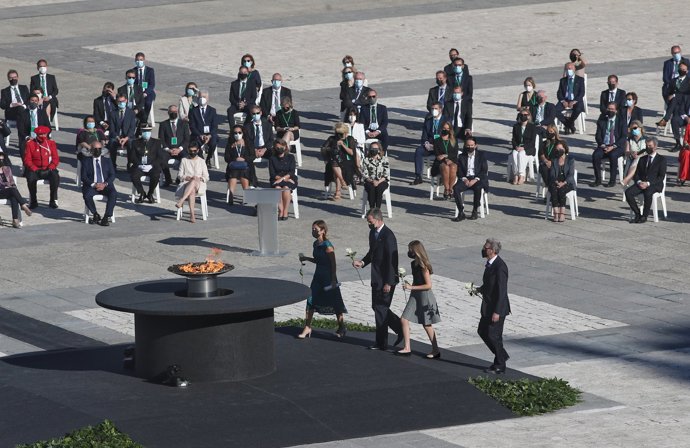 Hoy ha sido otro de esos días emotivos para toda la sociedad española. Los Reyes Felipe VI y Letizia, junto con sus hijas, la Infanta Sofía y la Princesa Leonor, han presidido la ceremonia de Estado, de carácter civil, por las víctimas de la pandemia de Covid-19. Los monarcas han llegado pocos minutos después de las 8:40 de la mañana al Palacio Real luciendo la mayoría de ellos un outfit de tono azul oscuro.