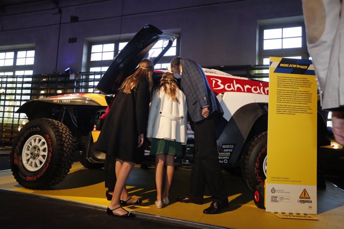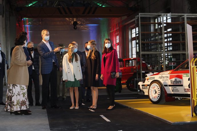 En las imágenes podemos ver a los Reyes Felipe y Letizia, junto a la Princesa de Asturias y la Infanta Sofía, acompañados por el presidente de Asturias, Adrián Barbón, posan junto a uno de los coches con los que Carlos Sáinz logró uno de sus triunfos, durante su visita a las instalaciones permanentes de ‘LAFPABRICA. Fábrica en Premios, organizadas por la Fundación Princesa de Asturias con motivo de la entrega de los galardones.