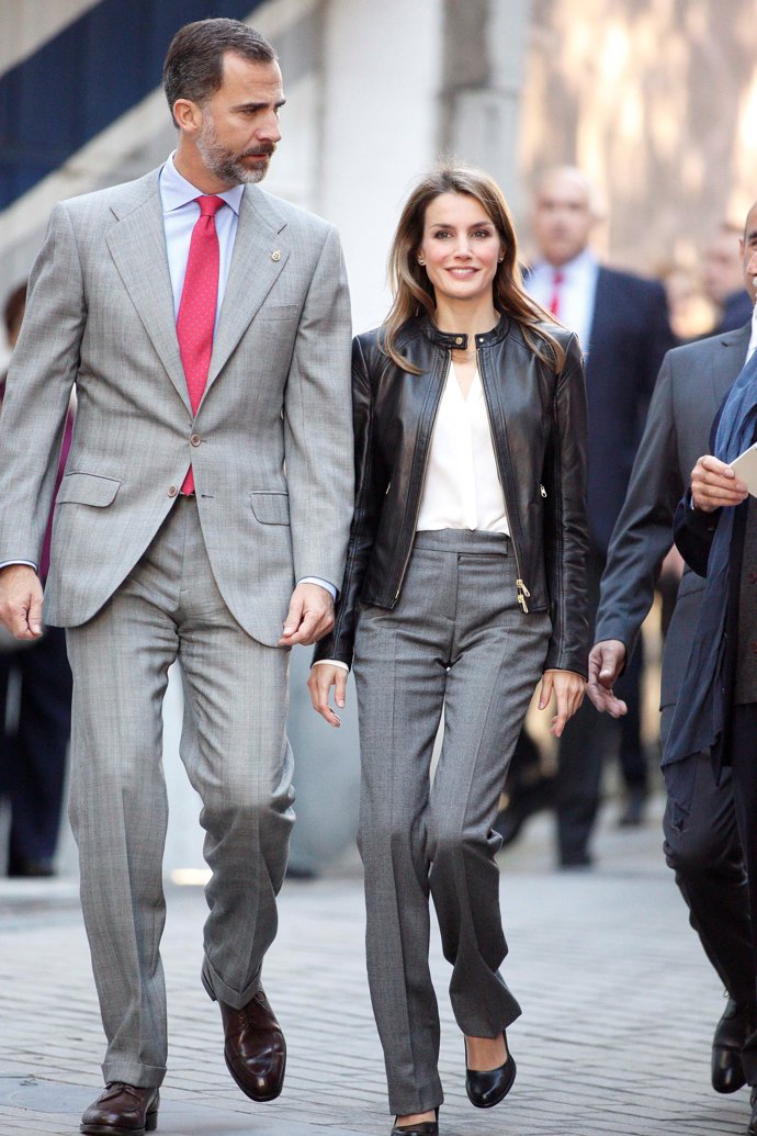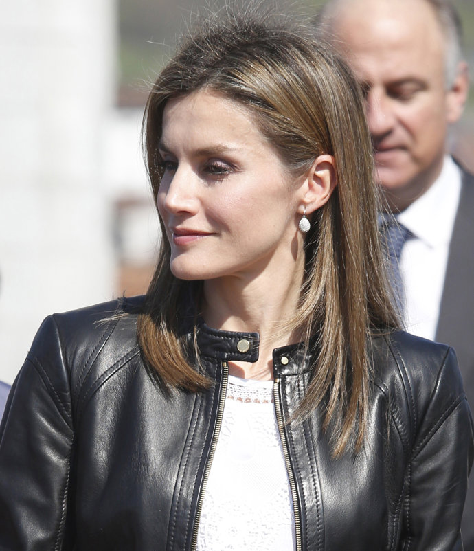 Para esta visita la Princesa eligió un conjunto en el que mezcló aires ejecutivos y moteros. Doña Letizia optó por un pantalón gris y camisa blanca con algunos adornos de encaje y cazadora negra de cuero de Hugo Boss. Pero si nos fijamos, no es la primera vez que la Princesa de Asturias ha llevado este look.
