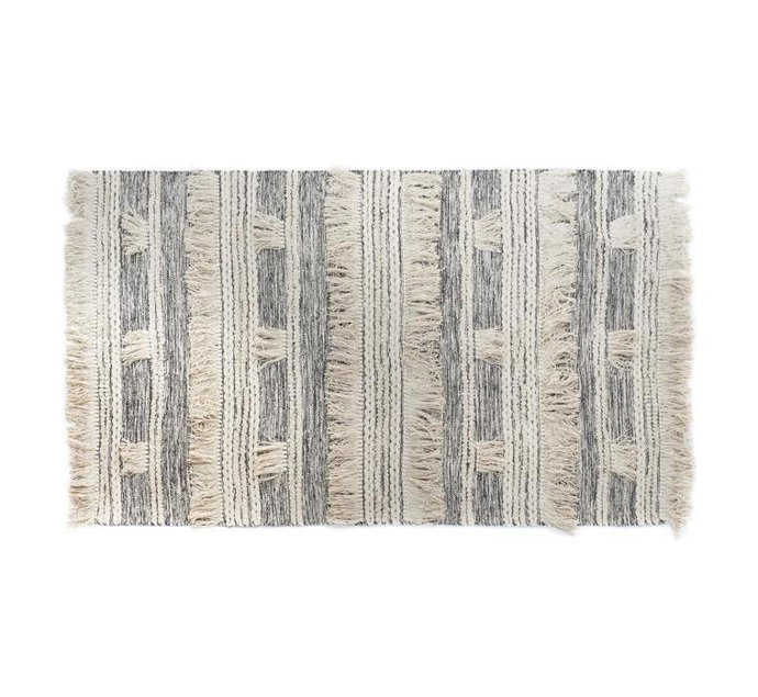 Para añadir calidez a un ambiente un detalle textil es siempre lo ideal. La alfombra Diza en algodón de rayas negras y flecos blancos se combina a la percección con otros complementos de color negro como las pantallas de las lámparas, los cuadrantes del sofá o los espejos de ratán o metal de la colección de Banak.