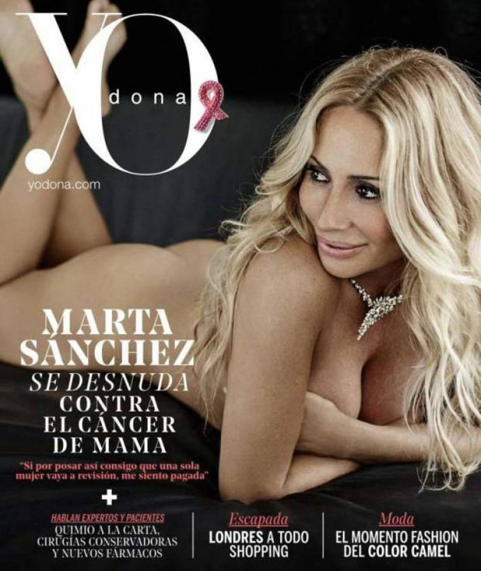 Como cada año la revista Yo Dona se ha comprometido en el mes de octubre a hacer una dición especial para comprometerse con la causa del cáncer de mama. La cantante Marta Sánchez ha posado desnuda en la portada del número rosa de este año, como forma de llamar la atención sobre la lucha contra esta enfermedad, que se llevó a su hermana melliza, Paz.