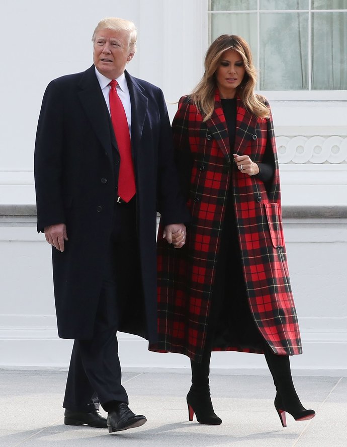 Para una cita tan importante, la primera dama de Estados Unidos se decantaba por el estampado de la temporada, y para recibir al elemento navideño por excelencia en la cultura anglosajona escogía un abrigo muy acorde para la celebración estilo capa, de diseño tartán y con aberturas laterales, que permitían a Melania sacar los brazos y cogerle la mano a su marido. Bajo el espectacular abrigo de Michael Kors de casi 4 mil euros, la mujer del presindete Trump escogía un look monocromático negro compuesto por un jersey de manga larga y un pantalón, que completaba con unas botas altas de tacón también negras.
