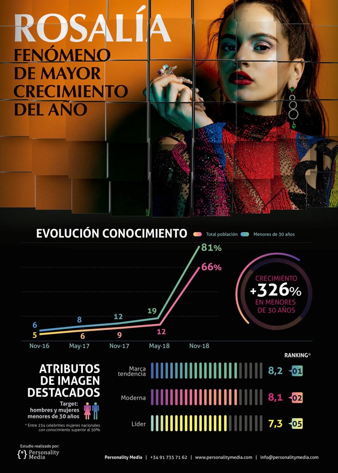 Rosalía es el fenómeno que más está creciendo desde que lanzó su primer disco, El Mal Querer. La multinacional española Personality Media, está especializada en el análisis de imagen de personajes públicos y este estudio de mercado del que se nutren las principales empresas publicitarias a nivel nacional e internacional, hace un análisis de los valores de imagen de más de 2.600 personajes públicos, entre los que se encuentra Rosalía.