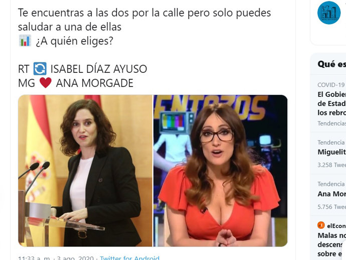 La propuesta ha tenido tanta acogida que se ha convertido en trending topic en la redes. Y la crítica unánime. Las fotografías escogidas para ilustrar la pregunta estaban seleccionadas para condicionar el voto. En ellas, mientras que Isabel Díaz Ayuso aparecía con chaqueta negra y camiseta blanca, Ana Morgade lo hacía con una prenda roja de prominente escote. Eso sí, acompañada de sus inseperables maxigafas con las que la presentadora de Yu: no te pierdas nada potencia su mirada.