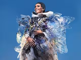 De nuevo bajo la dirección creativa de Josie, el estilismo de la presentadora es un homenaje a Manuel Piña y se trata de un diálogo entre el espectacular vestido del vanguardista diseñador - perteneciente al museo que lleva su nombre en su localidad natal, Manzanares (Ciudad Real) - una capa alada creada por Buj Studio y los complementos, a destacar el casco, de Manuel Albarrán. ¡Sin palabras!
