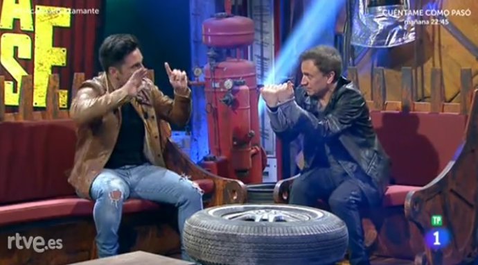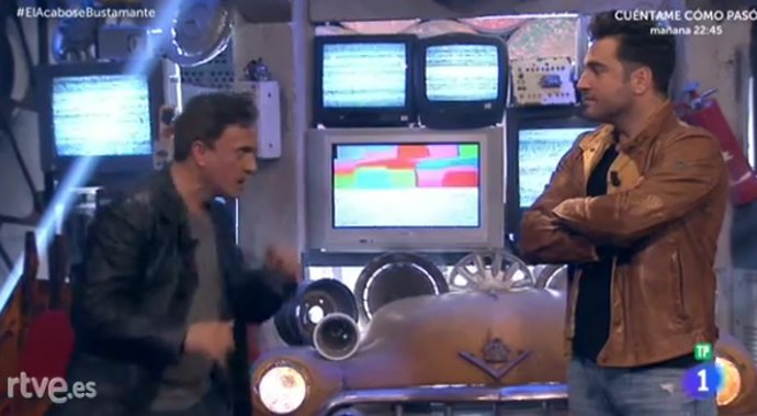 El momento "tenso" ha venido después, se ha visionado una aparición de David en sus orígenes, en el programa Cruz y Raya, en la que aparecía con gafas de culo de vaso, imitando (no se sabe muy bien a quién). Al volver al plató, el cantante se ha puesto tenso, se ha encarado al presentador, quién no ha dudado en plantarle cara y dar a pie a la pelea... la pelea más surrealista y cachonda de la historia.