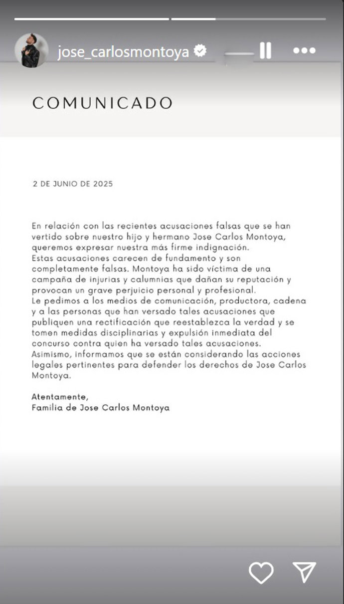 "En relación con las recientes acusaciones falsas que se han vertido sobre nuestro hijo y hermano José Carlos Montoya, queremos expresar nuestra más firme indignación. Estas acusaciones carecen de fundamento y son completamente falsas. Montoya ha sido víctima de una campaña de injurias y calumnias que dañan su reputación y provocan un grave perjuicio personal y profesional" han expresado tajantes.