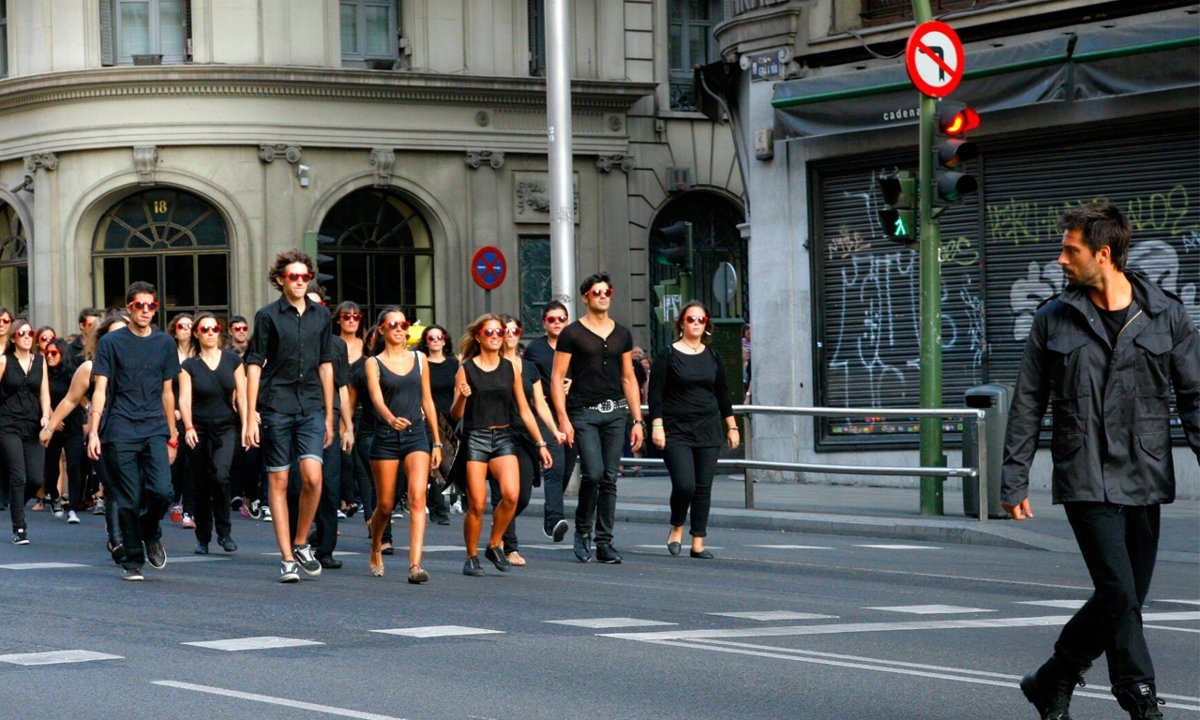 Este es el comienzo del spot de Vodafone dirigido por Álex de la Iglesia grabado en la Gran Vía madrileña que tuvo que ser cortada al tráfico varias horas durante la mañana de de ayer.