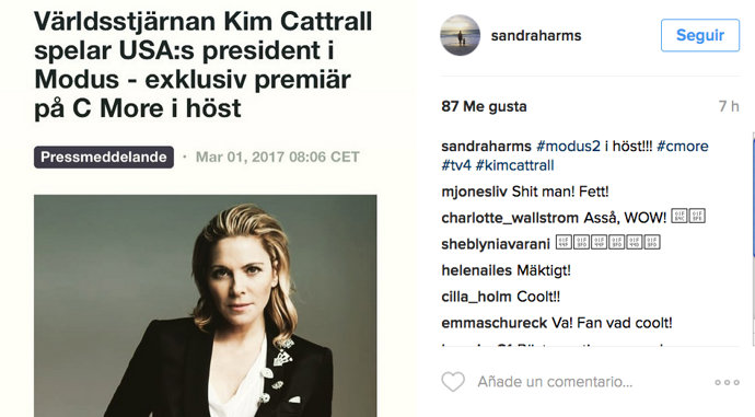 Kim Cattrall se encuentra en Suecia grabando parte de la segunda temporada de la serie Modus. La estrella de Sexo en Nueva York se ha unido al elenco de la producción en el papel de la presidenta de los Estados Unidos. "Me complace unirme a la producción de Modus en su segunda temporada y estoy deseando pasar un tiempo en Suecia, un país que siempre he querido visitar", dijo Cattrall. "Como fan del gran director sueco Ingmar Bergman, encantada de mi tiempo aquí", añadió la actriz de 53 años.