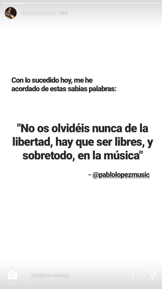 Vicente, el novio de Aitana, compartió en su Instagram Stories la misma reflexión, diciendo: "Con lo sucedido hoy, me he acordado de estas sabias palabra de Pablo López" y añadió la frase del cantante a la que también hizo alusión Cepeda.