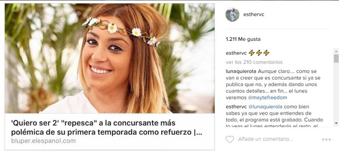 Así lo ha publicado la propia protagonista en sus redes sociales provocando muchas reacciones entre sus seguidores y no tan seguidores. Y es que a Esther no le tiemblan los dedos a la hora de contestar a los comentarios de su cuenta de Instagram. En una de sus publicaciones incluso llego a advertir sobre una posible denuncia.