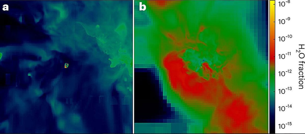Whalen y sus colegas descubrieron que, a medida que este oxígeno gaseoso se enfriaba y se mezclaba con el hidrógeno circundante dejado atrás por las supernovas, se formaba agua en los densos grumos de material que quedaban. Es probable que estos grumos fueran sitios para la formación de la segunda generación de estrellas y planetas.